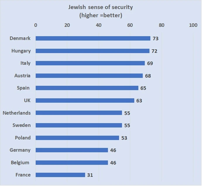 The countries where Jews in Europe feel most secure are Denmark and Hungary, with Hungary also ranking first with the lowest number of Jews experiencing anti-Semitic attacks, followed by Italy.
