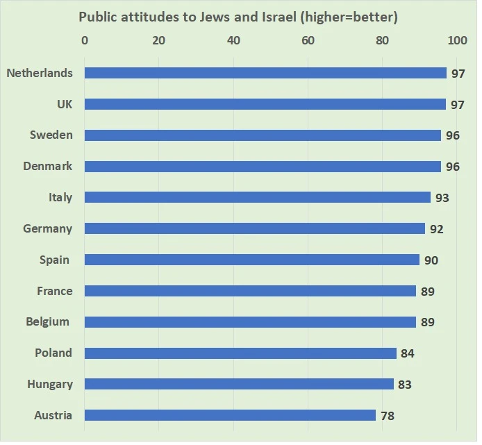 Of the 12 countries where the most Jews live in Europe and that were included in the survey, they were specifically ranked as follows – from most friendly to least friendly to their Jews: 1) Italy, 2) Hungary, 3) Denmark, 4) United Kingdom, 5) Austria, 6) the Netherlands, 7) Sweden, 8) Germany, 9) Spain, 10) France, 11) Poland and 12) Belgium.