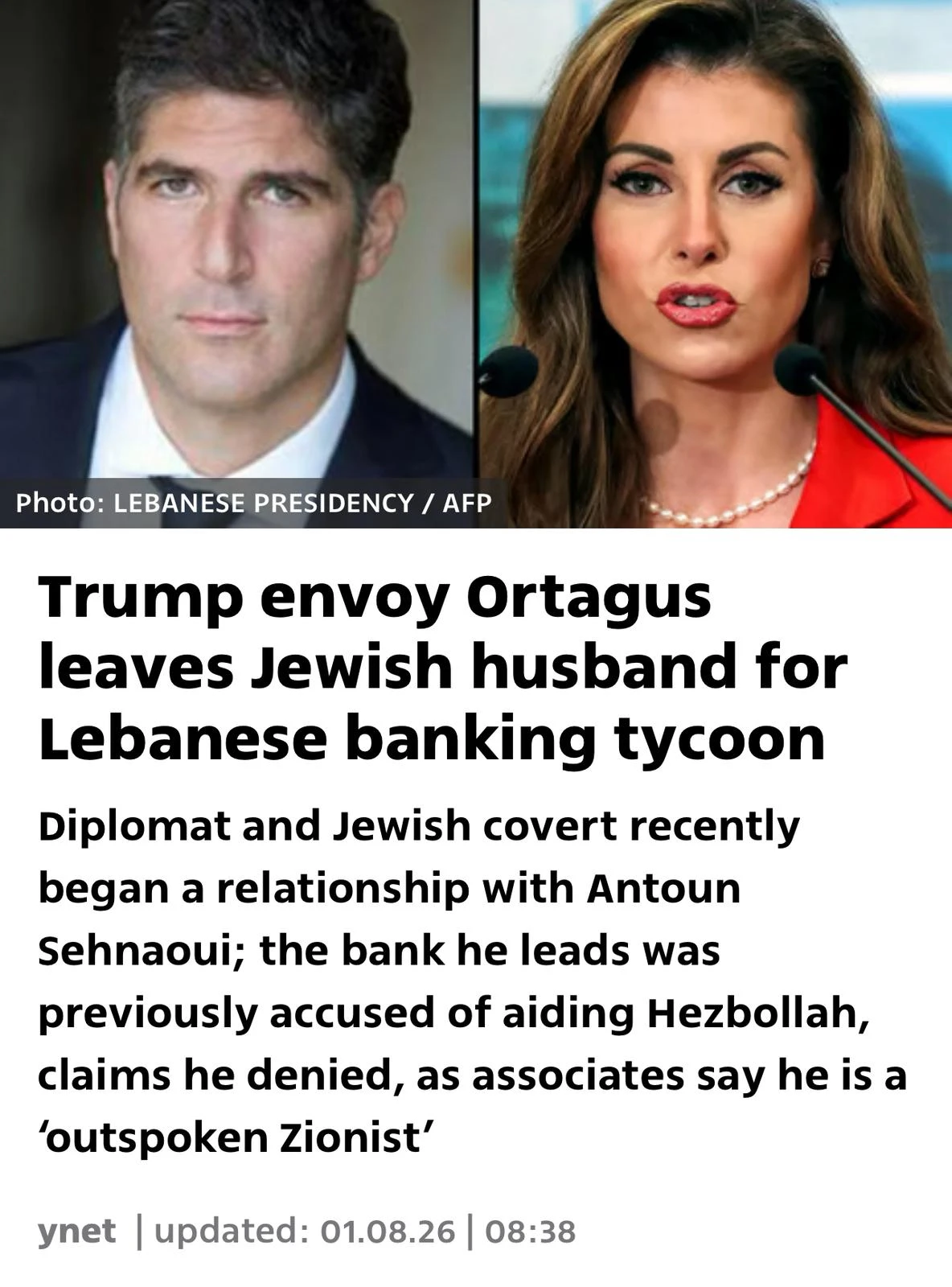 “Ortagus, a U.S. diplomat closely associated with President Donald Trump, has divorced her Jewish husband and begun a romantic relationship with Lebanese tycoon Antoun Sehnaoui,” reported Ynet, a leading Israeli news site, which has picked up on these growing attacks.