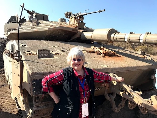 Arlene Bridges Samuels next to Israel’s “chariot”, the Merkava tank