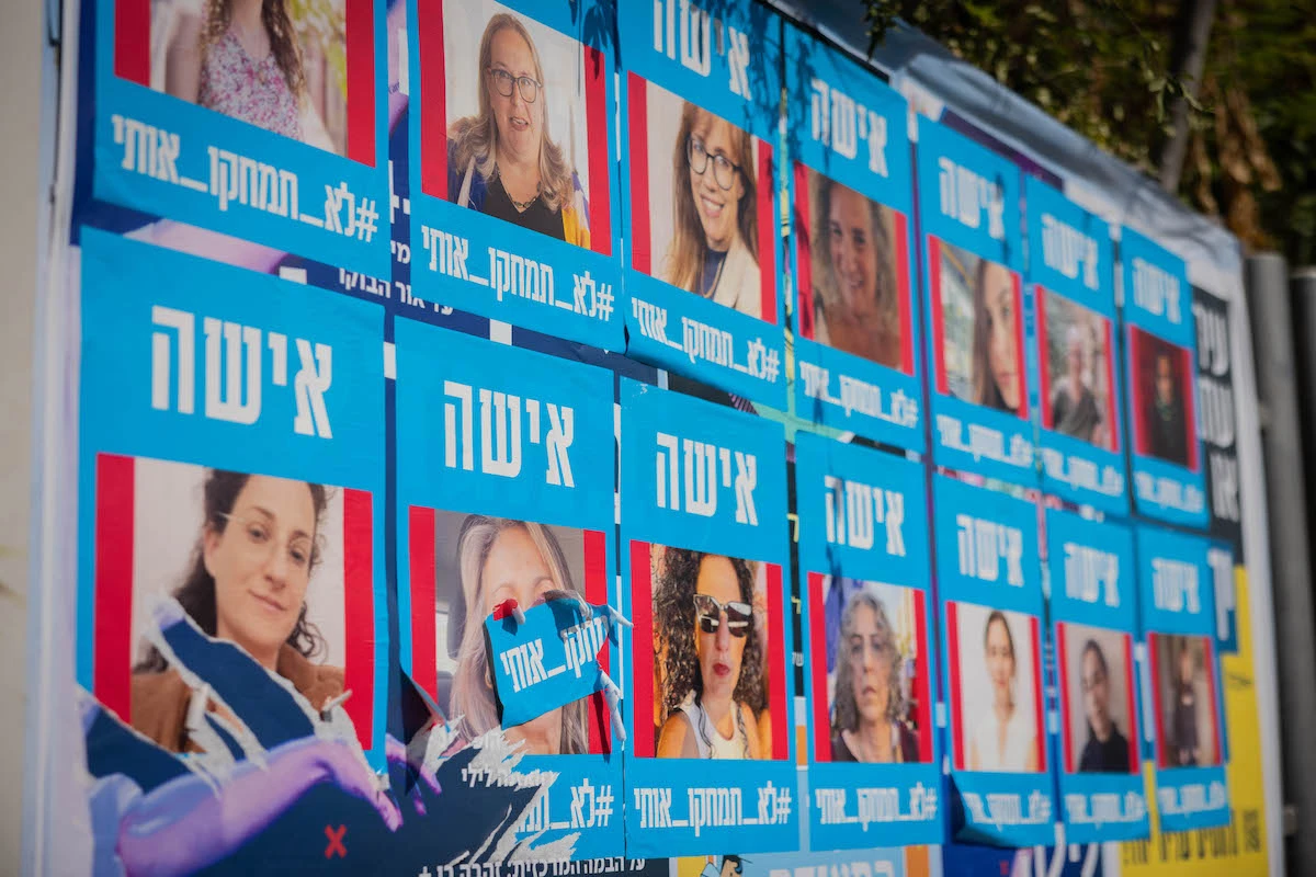 Pictures of women hang on a bulletin board after recent incidents of gender discrimination around Israel, in Jerusalem, Aug. 21, 2023. (Photo: Chaim Goldberg/Flash90)