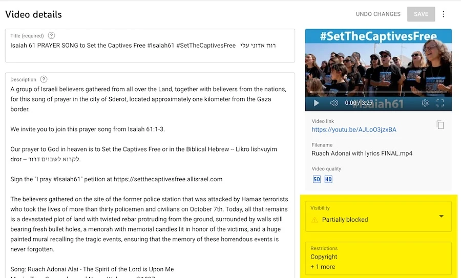 ALL ISRAEL NEWS has a signed Music License Agreement with Sperandeo and Waksman to distribute the song Ruach Adonai Alai as part of its campaign, #SetTheCaptivesFree #Isaiah61. Therefore, there is absolutely no reason for YouTube to partially block the video. Perhaps there is a deeper reason why YouTube wants to limit the audience for this prayer song video?
