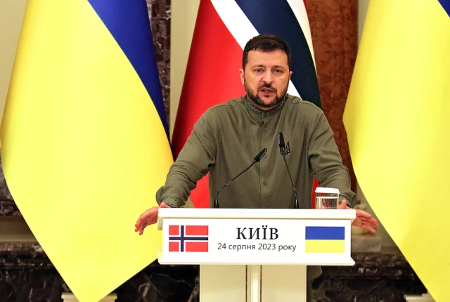 Ukrainian President Volodymyr Zelenskyy speaks during a joint press conference with Prime Minister of Norway Jonas Gahr Store, in Kyiv, Aug. 24, 2023. (Photo: Future Publishing via Reuters)